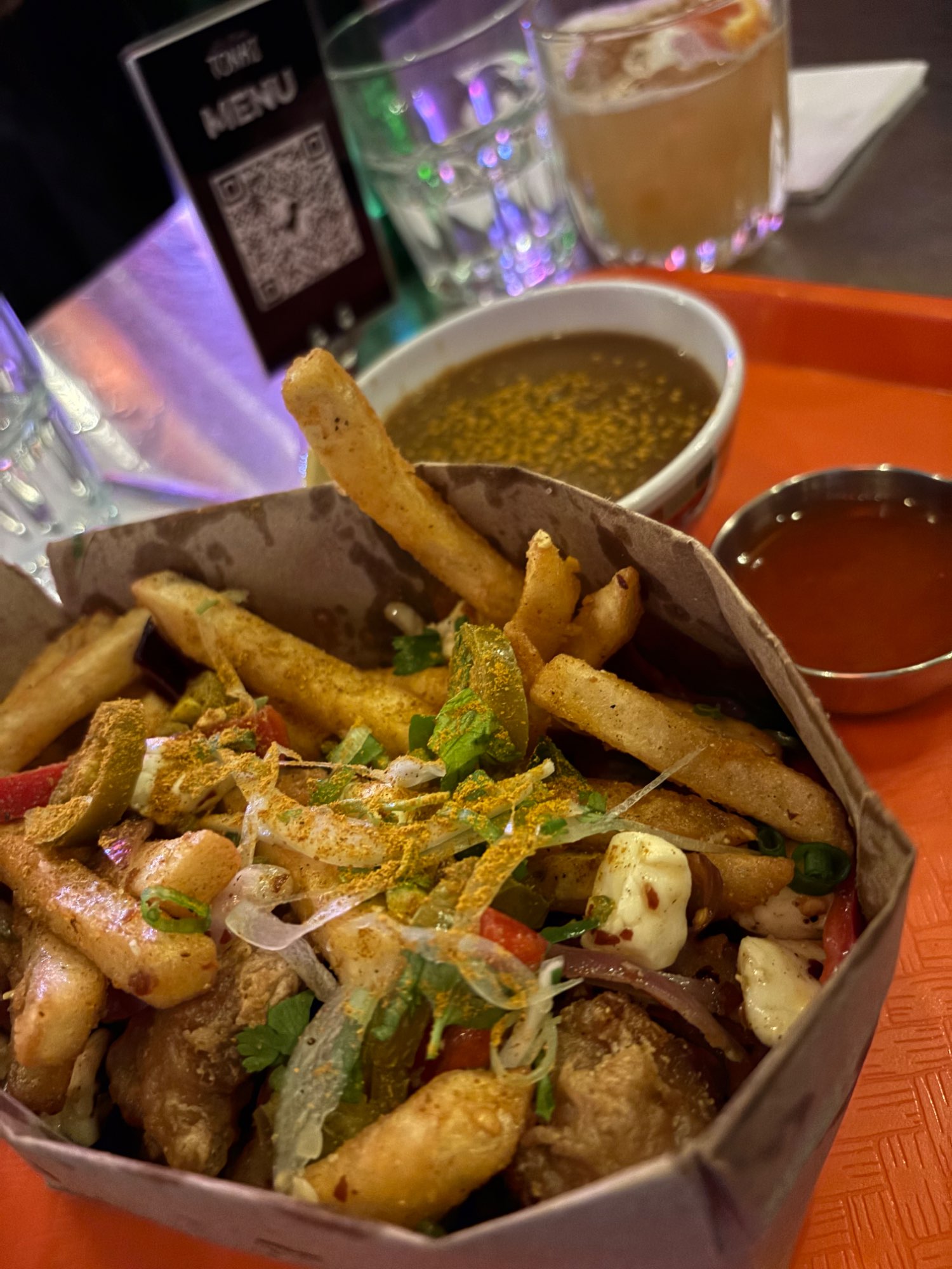 Poutine super originale, servie dans un sac, oui oui, et ça fonctionne très bien ! Un mélange de cultures vraiment réussi. Des frites super croustillantes et très goûteuses. Des oignons et légumes relevés et délicieux. Le poulet pané était juste incroyable et tendre. La sauce, savoureuse est servie à part, ce que j’ai beaucoup aimé pour pouvoir ajouter la bonne dose. Pour finir, l’ambiance du resto, rétro, conviviale et chaleureuse, ainsi que le staff, sont un must. Mission réussie !