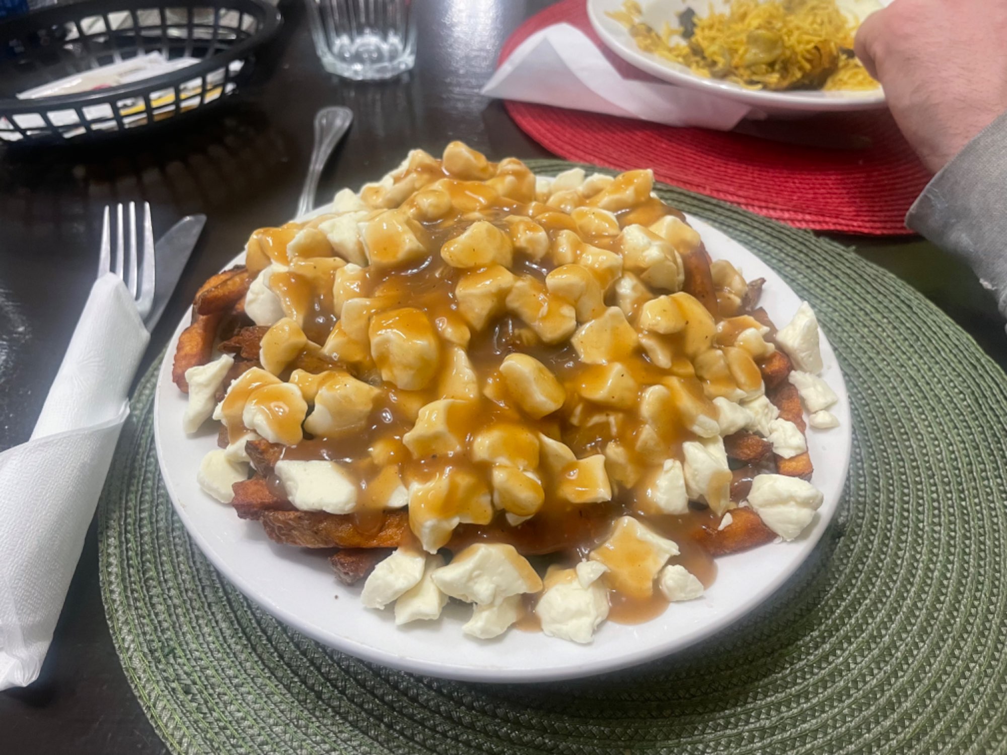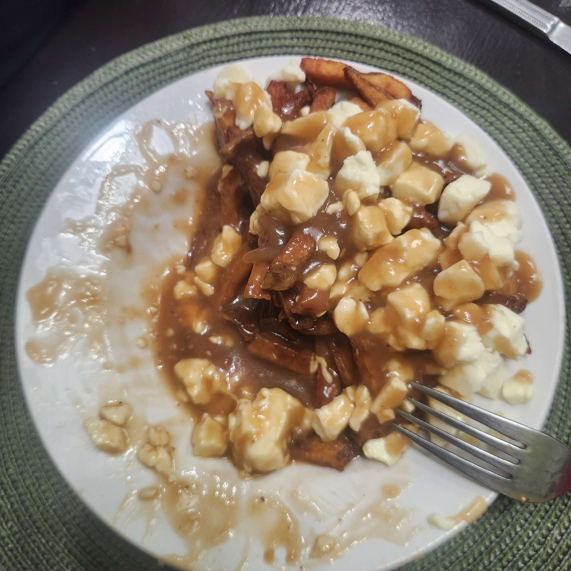 Excellente frites, trop de fromage en grain et sauce brune trop salée.
