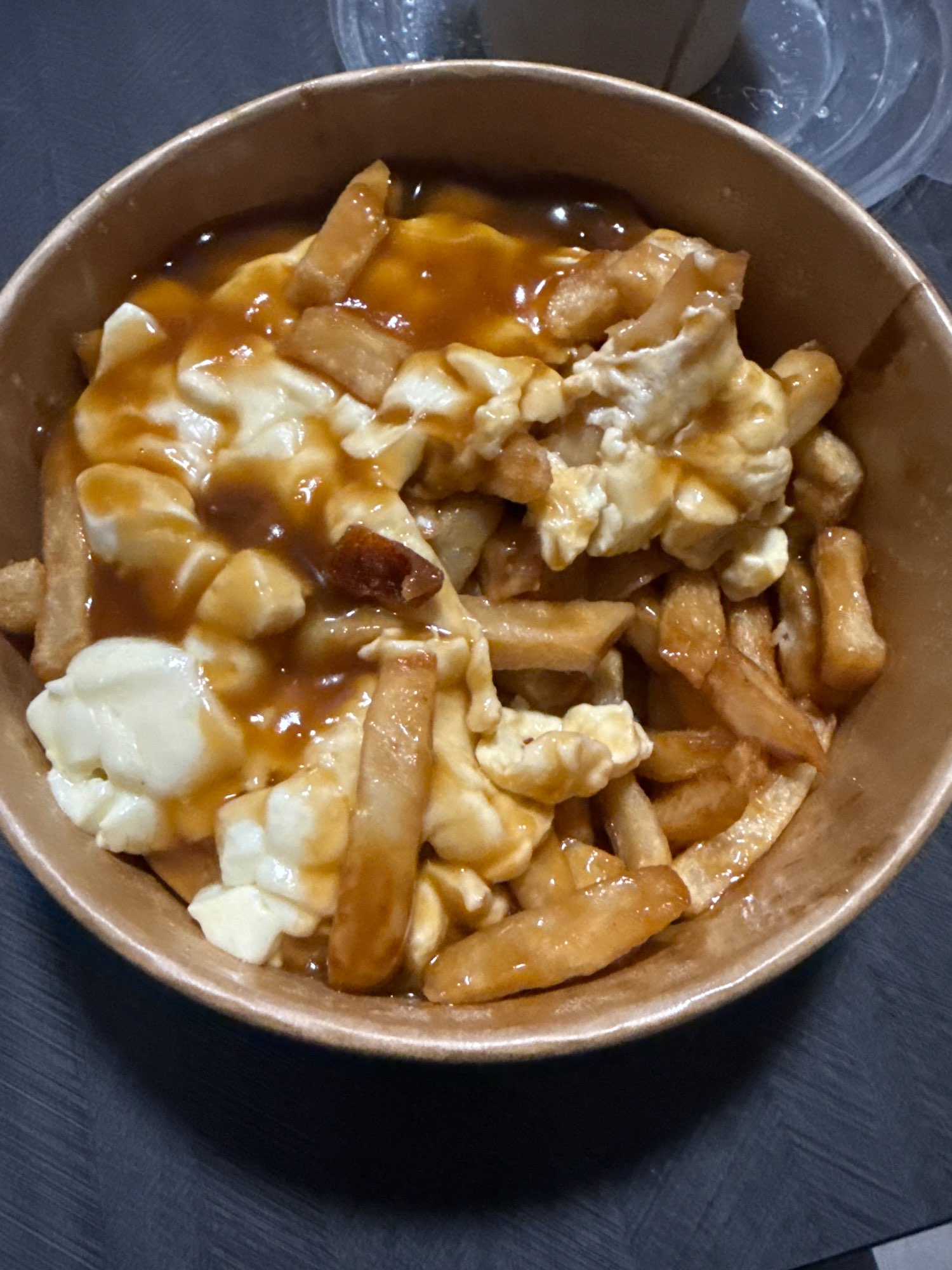 Frites à base de patates blanches (basic) et pas super croustillantes. La sauce est très goûteuse et le fromage frais et généreux pour la portion.