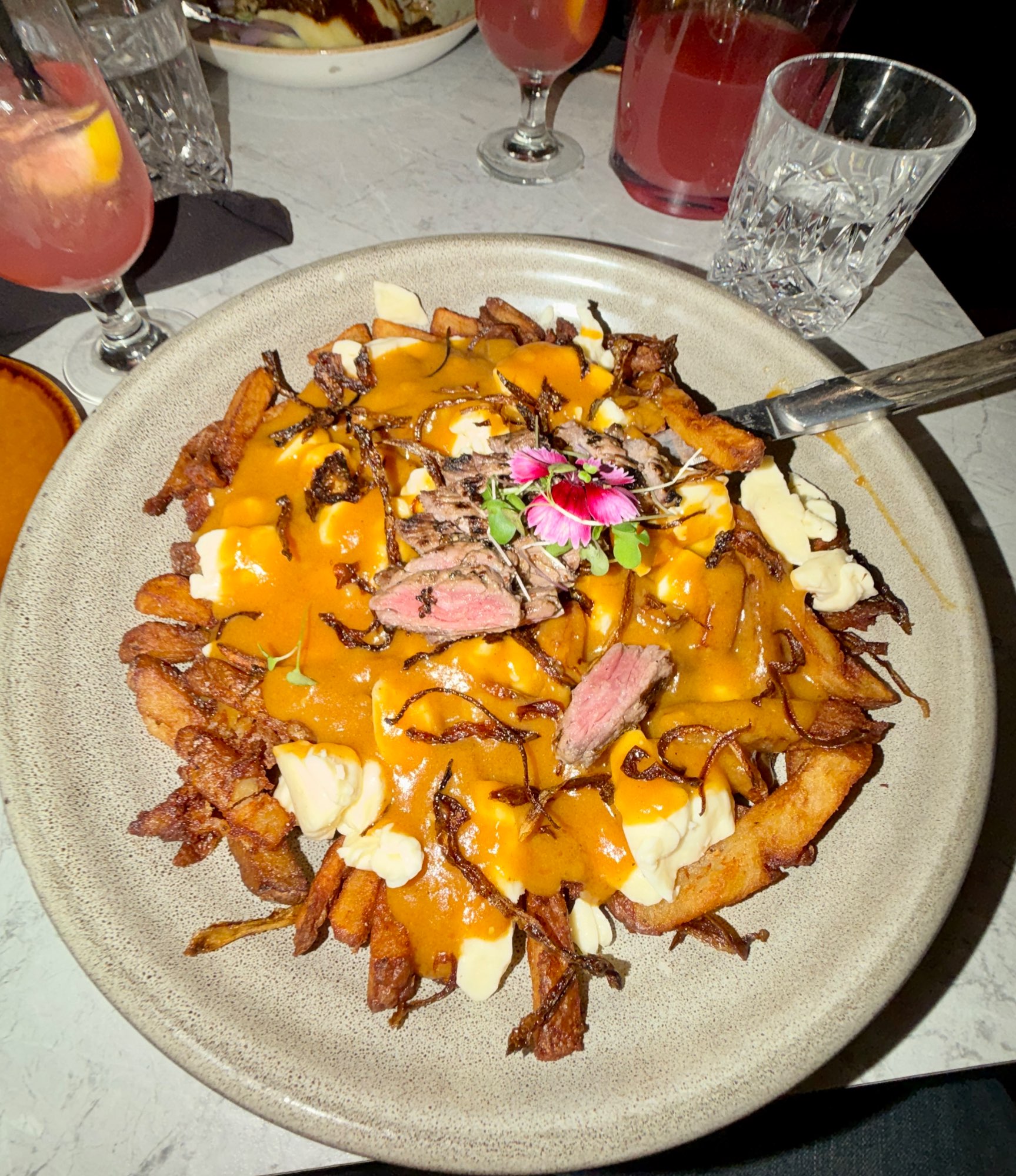 Excellente endroit . Belle ambiance et excellente musique. La poutine Les garnements. Frite très brune molle. Style très cantine <3 Sauce maison très qui ne ressemble à personne. Presqu’à mon goût. Je n’arrive pas à mettre le point sur ce qui manque. Fromage st-guillaume pas squick ni frais. Je sais pas pourquoi les restos fancé ont la mauvaise habitude d’avoir un fromage très boff. Bavette de boeuf medium excellente ! Le tout dans une grosse portion que je ne suis pas arrivé à finir. Très salé aussi Résultat c’est quand même surprenant comme plat