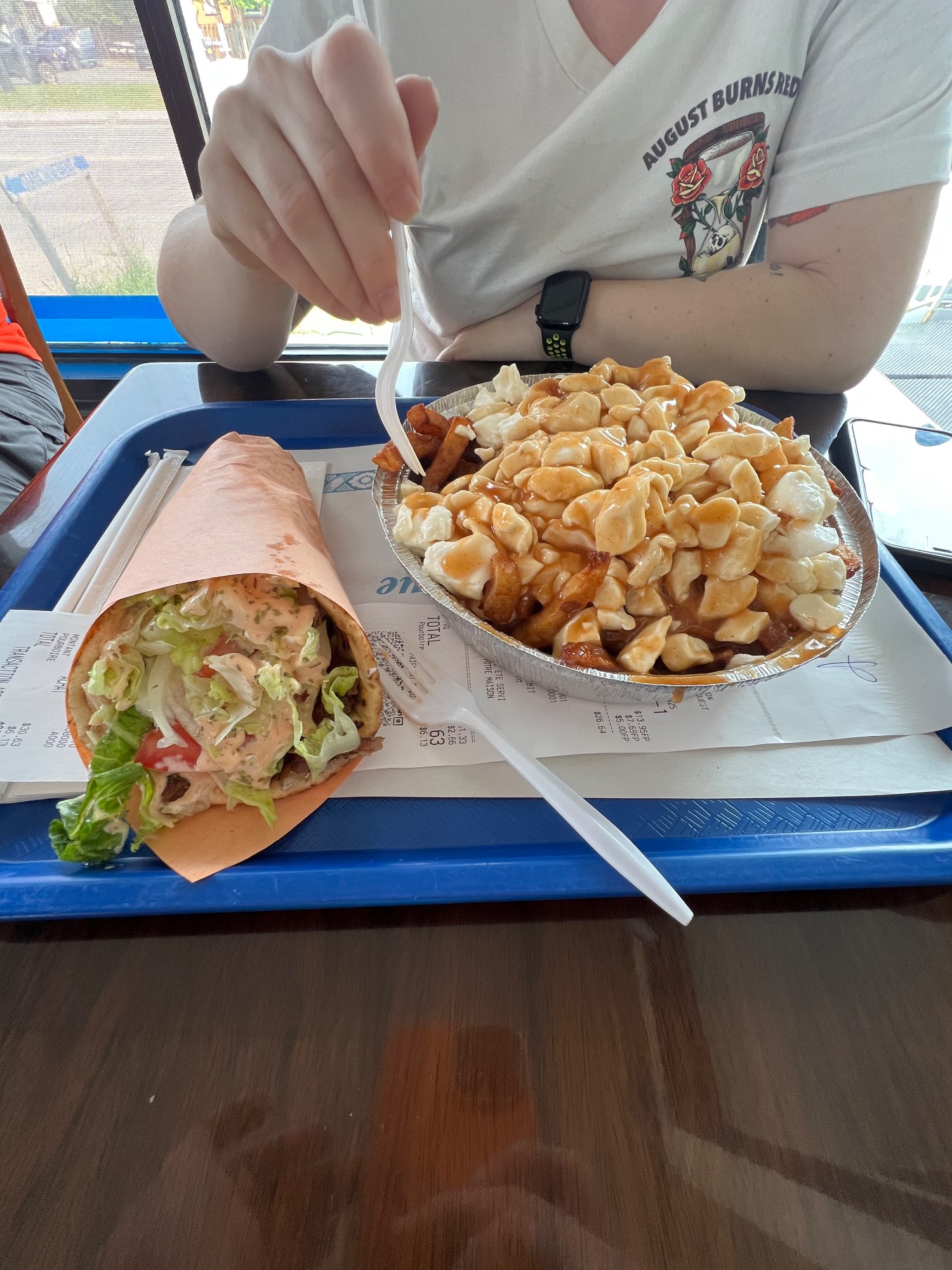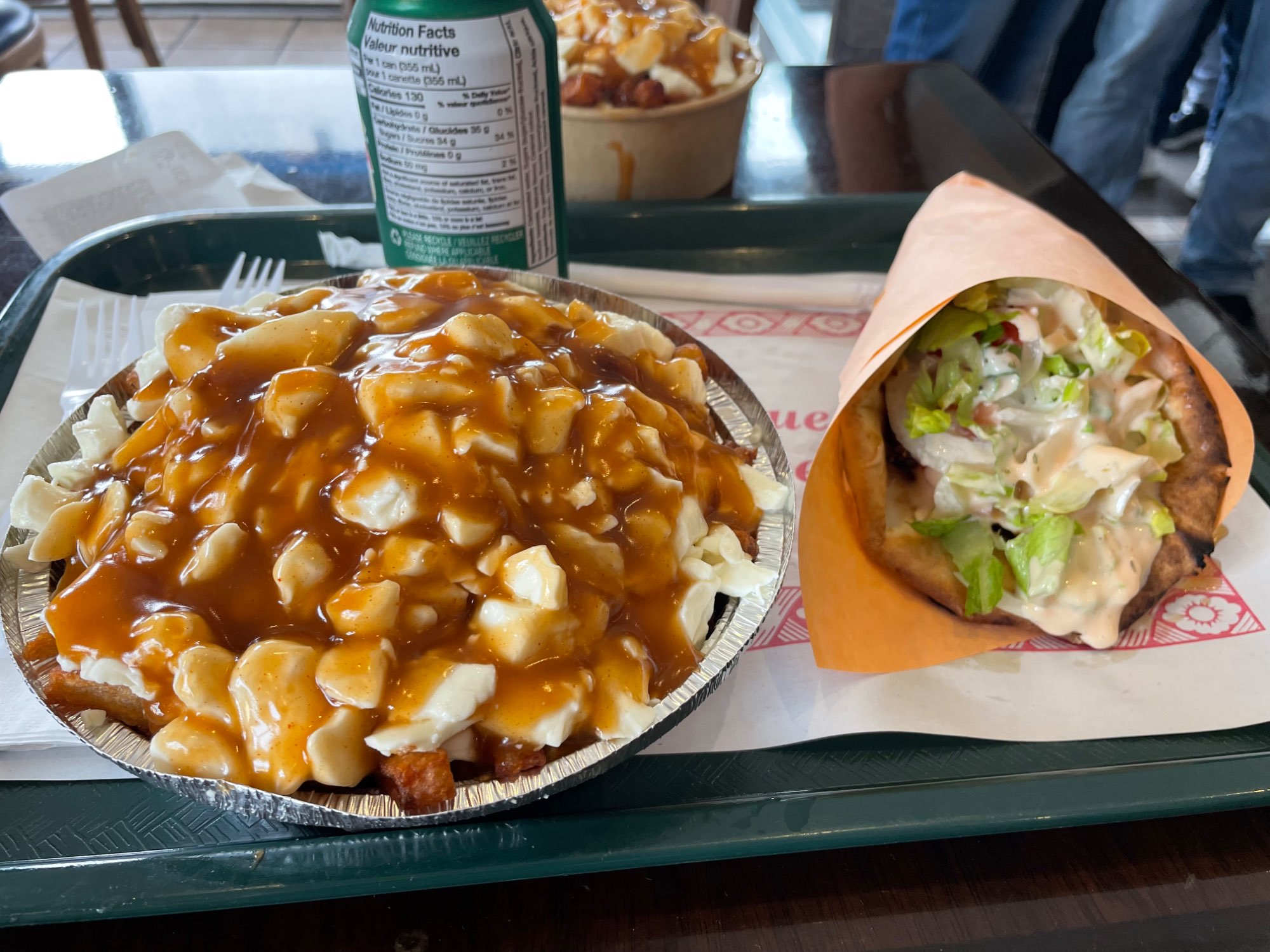 Frite maison tendre bon format Sauce mix avec un goût de sauce brune qui se fait différencié un peu des autres. Fromage quantité énorme et excellent. Le gyro est très bon . Je le conseil si vous avez une bonne appétit ou si vous partagez votre assiette. Félicitation !